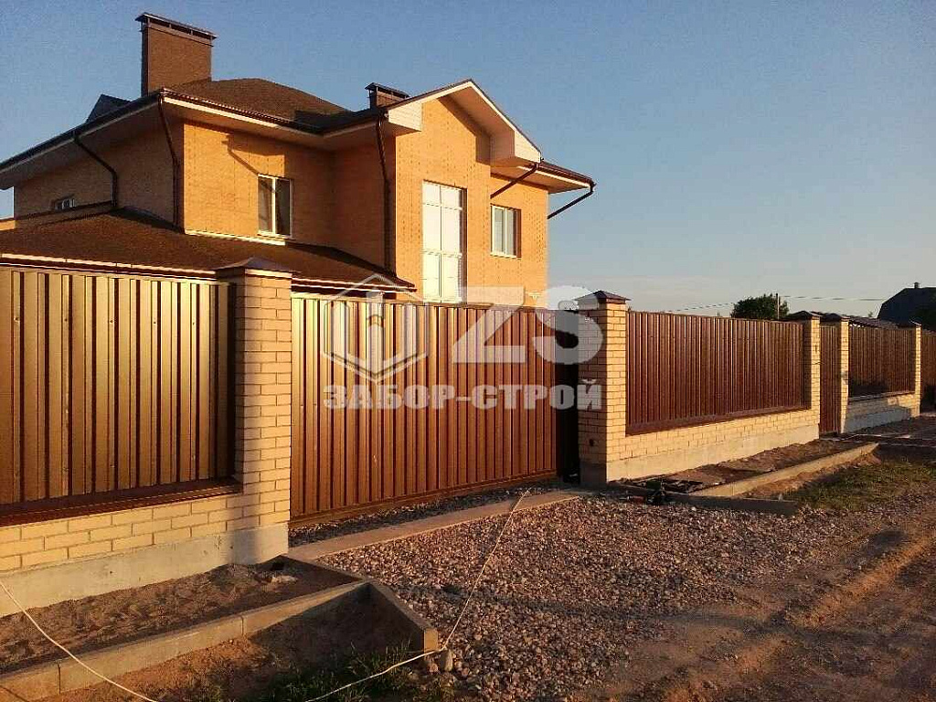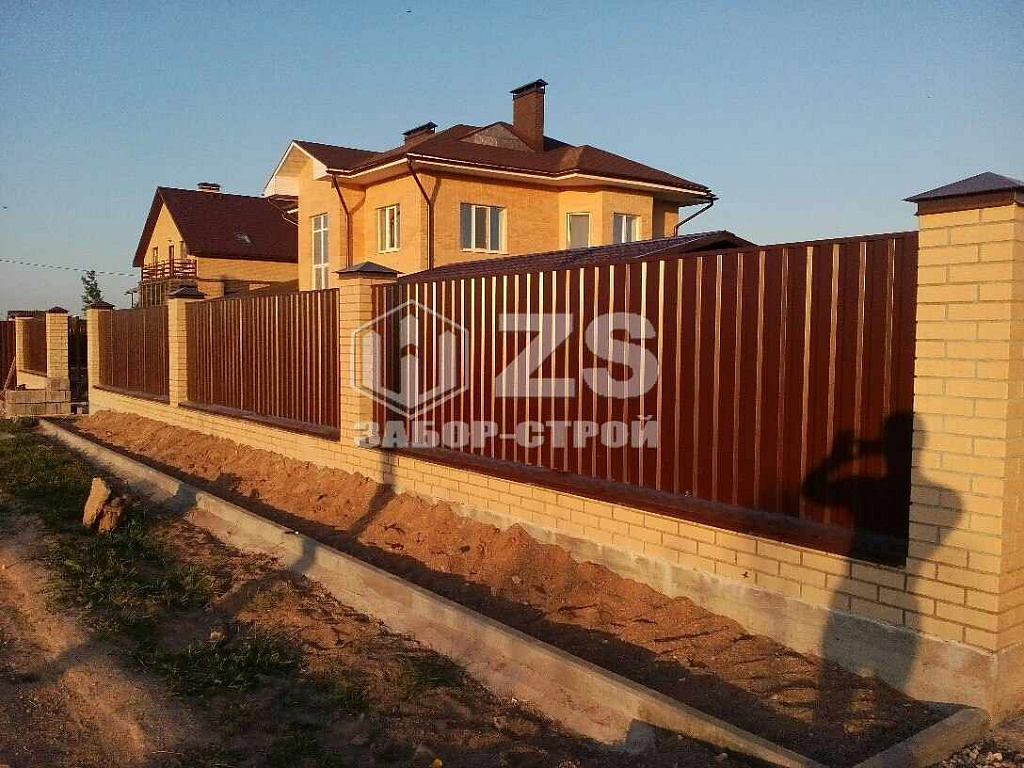 - Забор с кирпичными столбами из профнастила 10 соток